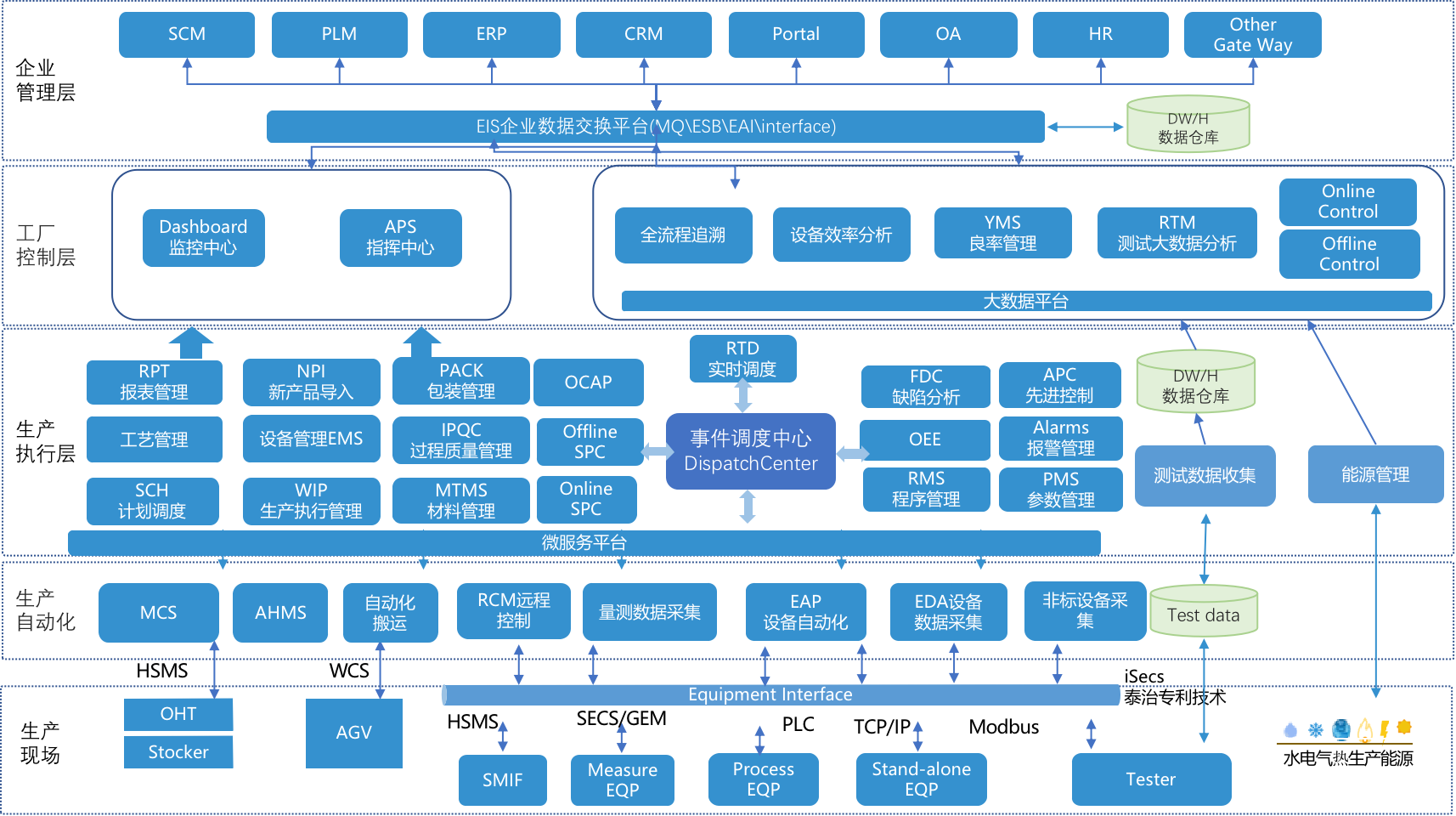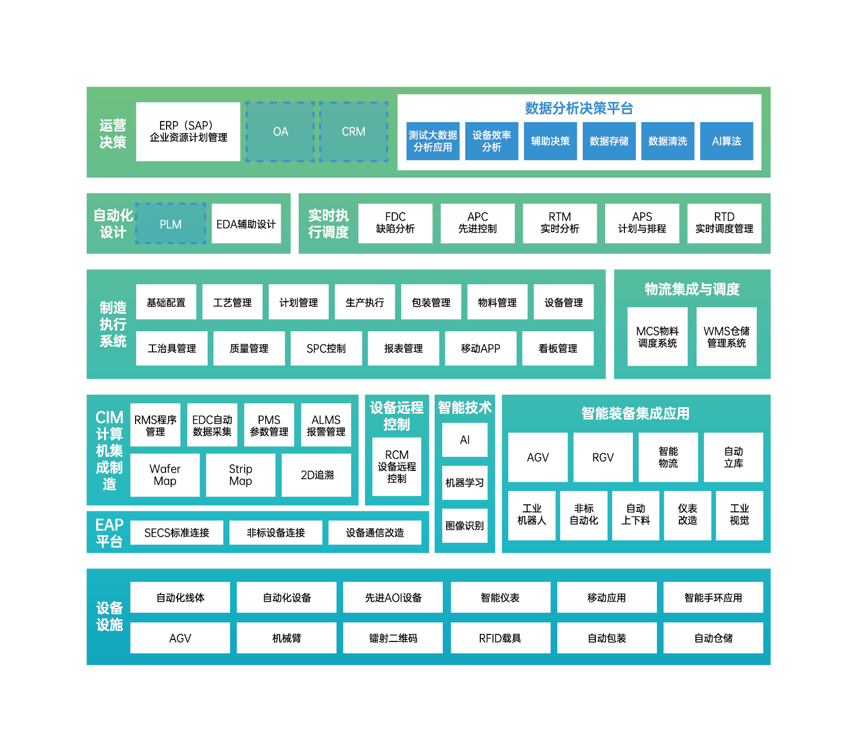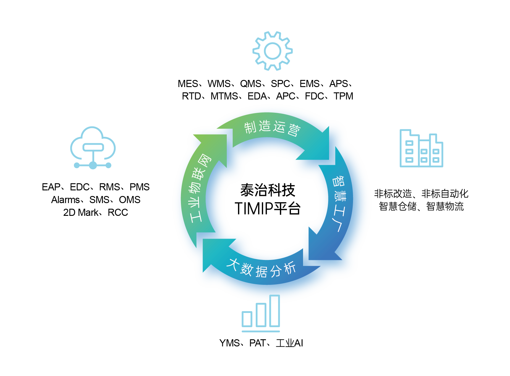 泰治科技自主研发的TIMIP平台打造了一系列满足IC制造和封测、PCB制造、LED制造等行业的制造执行系统,横向涵盖了泛半导体完整产业链,纵向涵盖了从设备自动化控制、生产制造运营、数据决策分析等系统,以及可靠的智能硬件解决方案,全面赋能泛半导体行业智能制造。