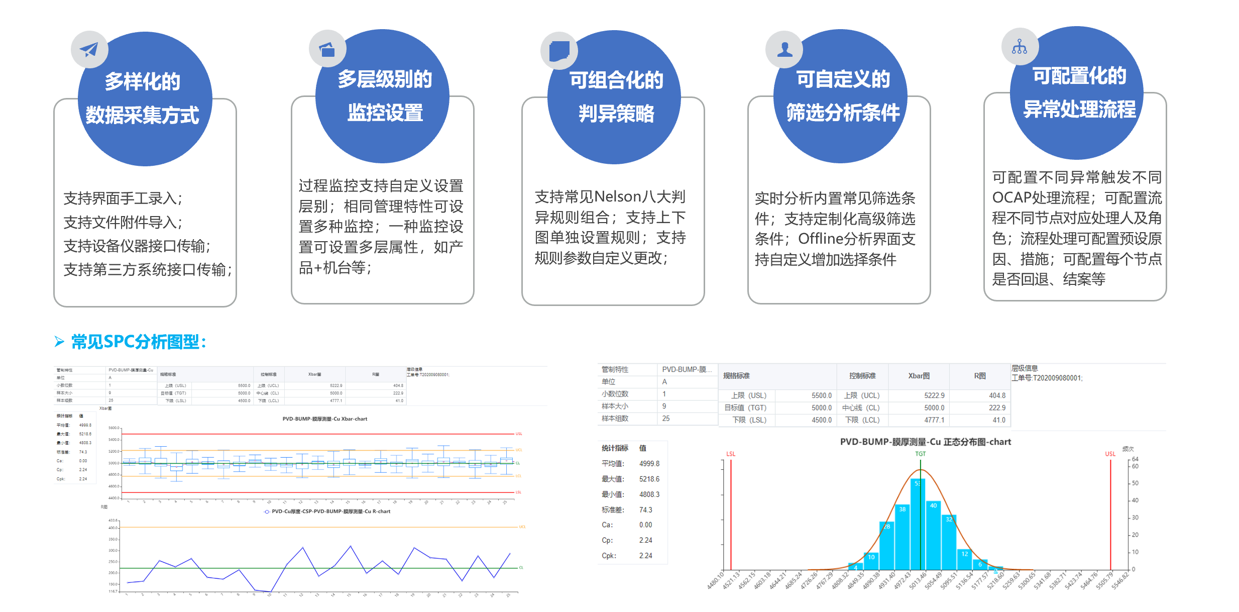 相较于传统SPC,TIMIP SPC更贴近国内半导体行业使用场景,具备多样化的数据采集方式、多层级别的监控设置、可组合化的判异策略、可自定义的筛选分析条件及可配置化的异常处理流程等功能,无论是系统界面图型展示、数据表格呈现,还是可细化到界面按钮级别的权限配置,都在业界具有良好口碑和较强竞争力。