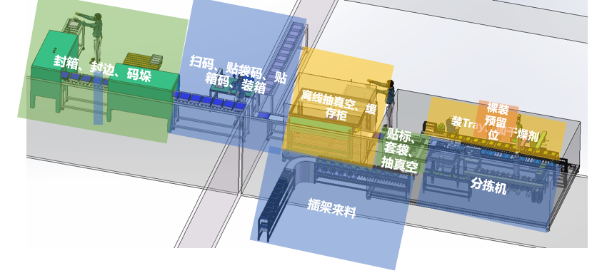 设备布局由插架来料开始,首先视觉对产品品类分批,再将同批类产品入袋,到封边、封箱、码垛结束。整体分为内包、外包两大包区,共7个小工站,涵盖了贴标、抽真空、扫码等多个环节,能够支持正反检测、方向检测等功能,并支持自动翻正与调整方向,人工仅需添加辅材及码垛发货。