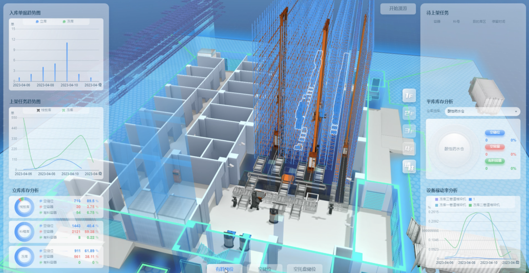 在为某客户打造的数字孪生智能立库项目中,泰治科技利用立体3D建模,将数字化管理的信息和数据应用于模型,通过1:1全要素还原,实现空间可视化设备可视化作业可视化告警可视化等多专业的动态可视化管理,并能实现空间设备的快速定位、故障和应急预案的动态模拟、应急处置的过程调度等动态交互功能,大大提高了运维效率和准确性。